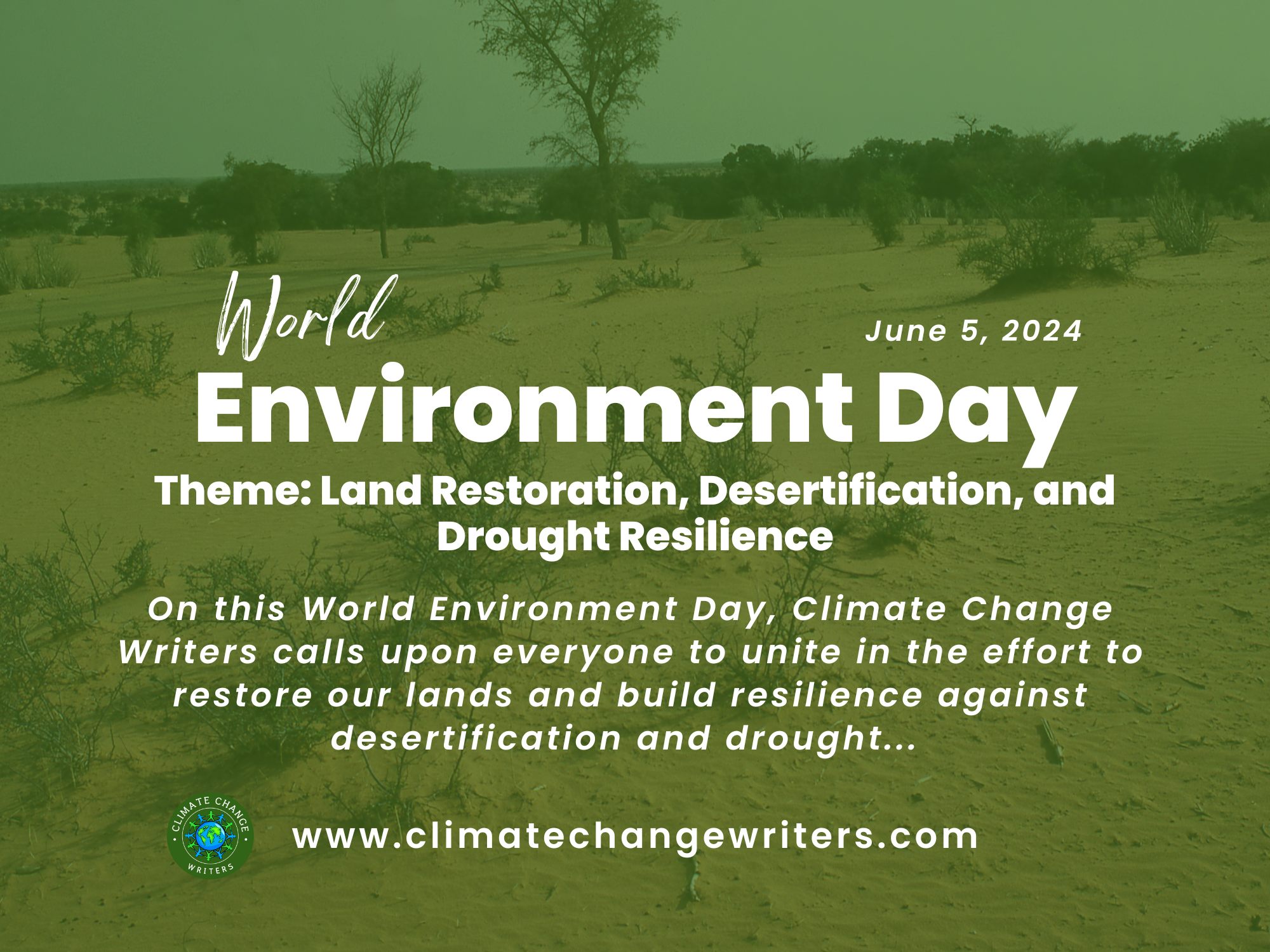 On this World Environment Day, Climate Change Writers calls upon everyone to unite in the effort to restore our lands and build resilience against desertification and drought. Through collective action and sustainable practices, we can turn the tide on land degradation and ensure a healthier, more resilient planet for future generations.